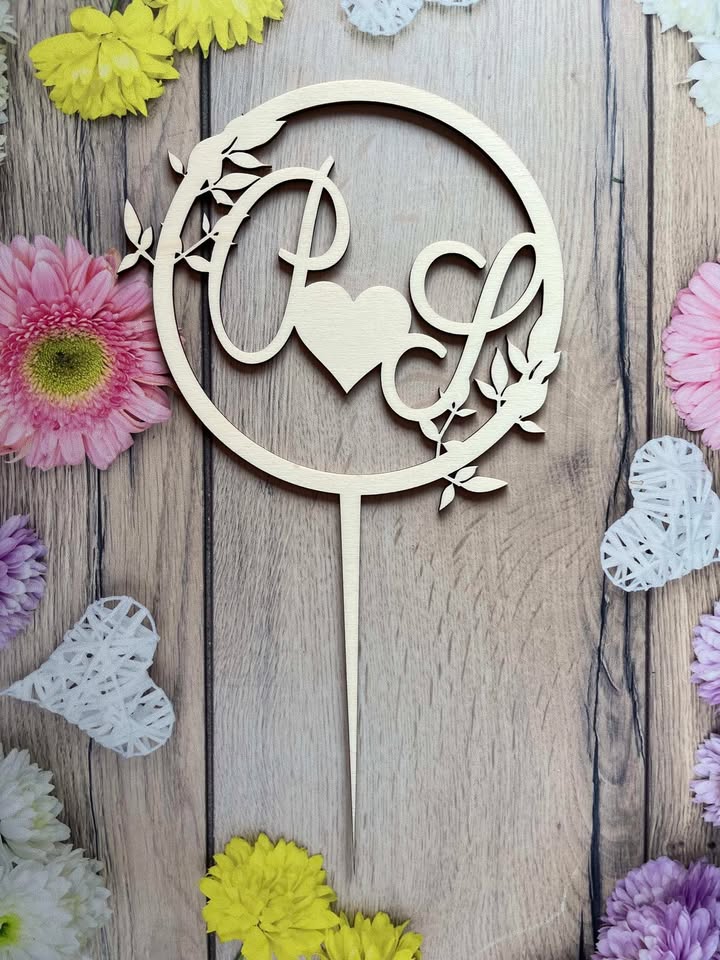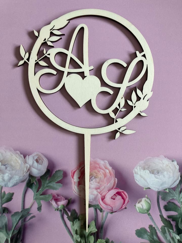 Tento nádherný drevený zápich v štýle greenery so srdiečkom predstavuje dokonalú kombináciu prírodnej elegancie a personalizácie. Je zdobený jemnými lístkami so začiatočnými písmenami novomanželov, medzi ktorými sa nachádza vyrezané srdiečko. Tento romantický a rustikálny dizajn je ideálny pre svadobné torty s prírodným, boho alebo rustikálnym nádychom.