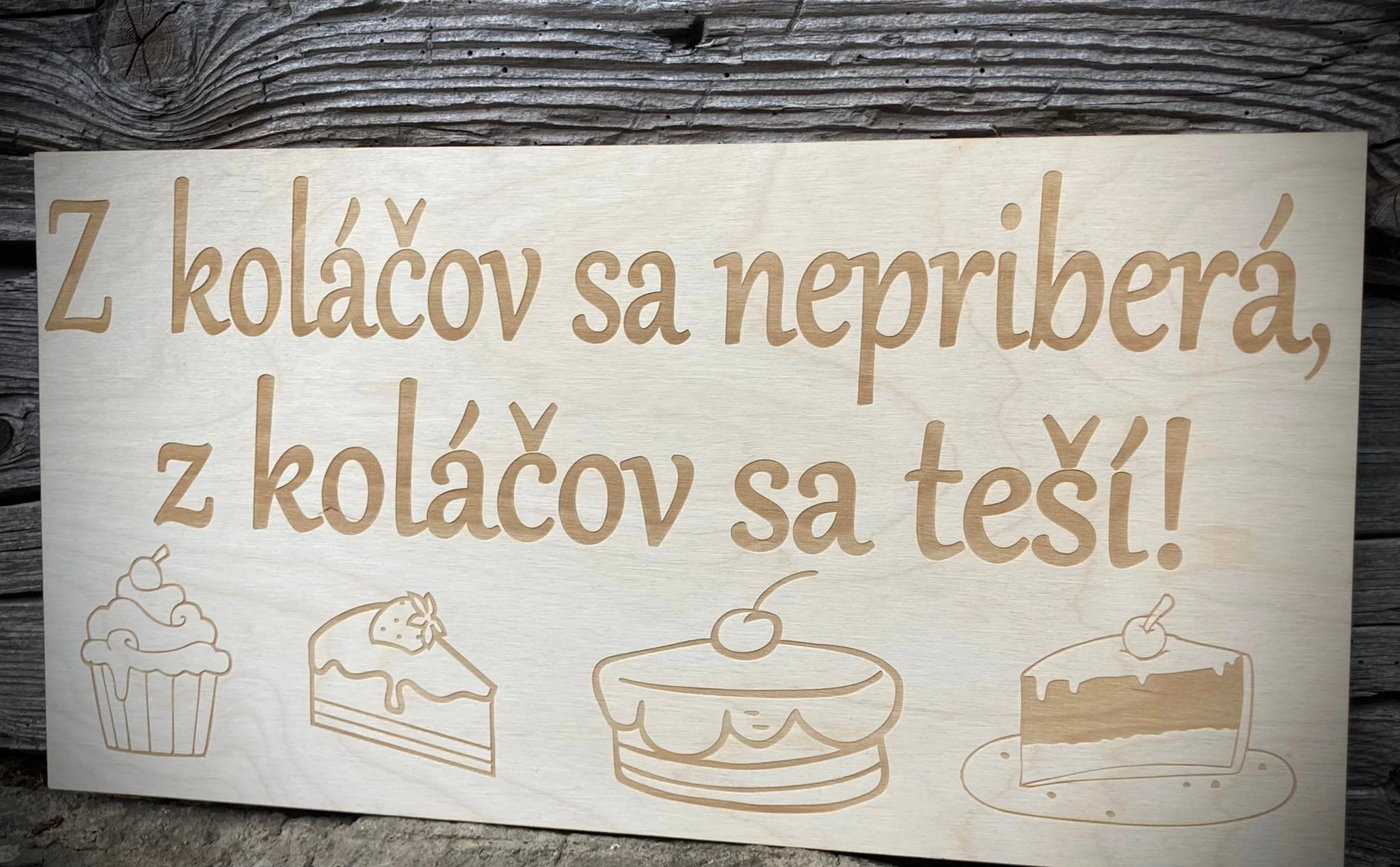 Drevená tabuľka – Z koláčov sa nepriberá je originálny a vtipný doplnok, ktorý prinesie úsmev na tvár každému milovníkovi sladkostí. Tabuľka obsahuje nápis: