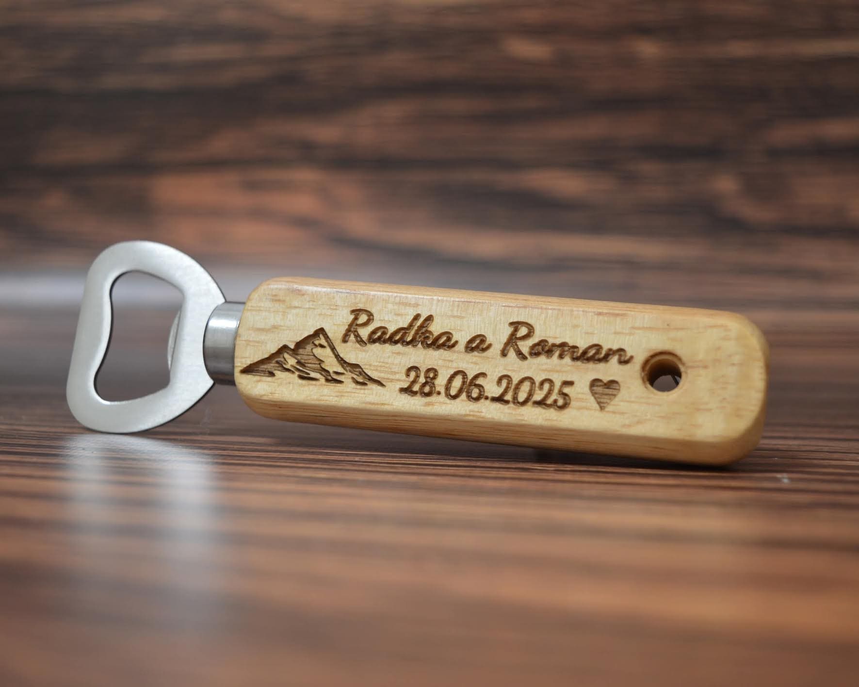 Drevený otvárak na pivo s gravírovaným horským motívom, menami a dátumom je dokonalým personalizovaným darčekom. Tento praktický a štýlový otvárak je vyrobený z kvalitného dreva a kovu, čo zaručuje jeho odolnosť a dlhú životnosť. S gravírovanými detailmi je ideálnou spomienkou na svadbu, výročie alebo iné výnimočné udalosti. Perfektný doplnok, ktorý spája funkčnosť s osobným odkazom.