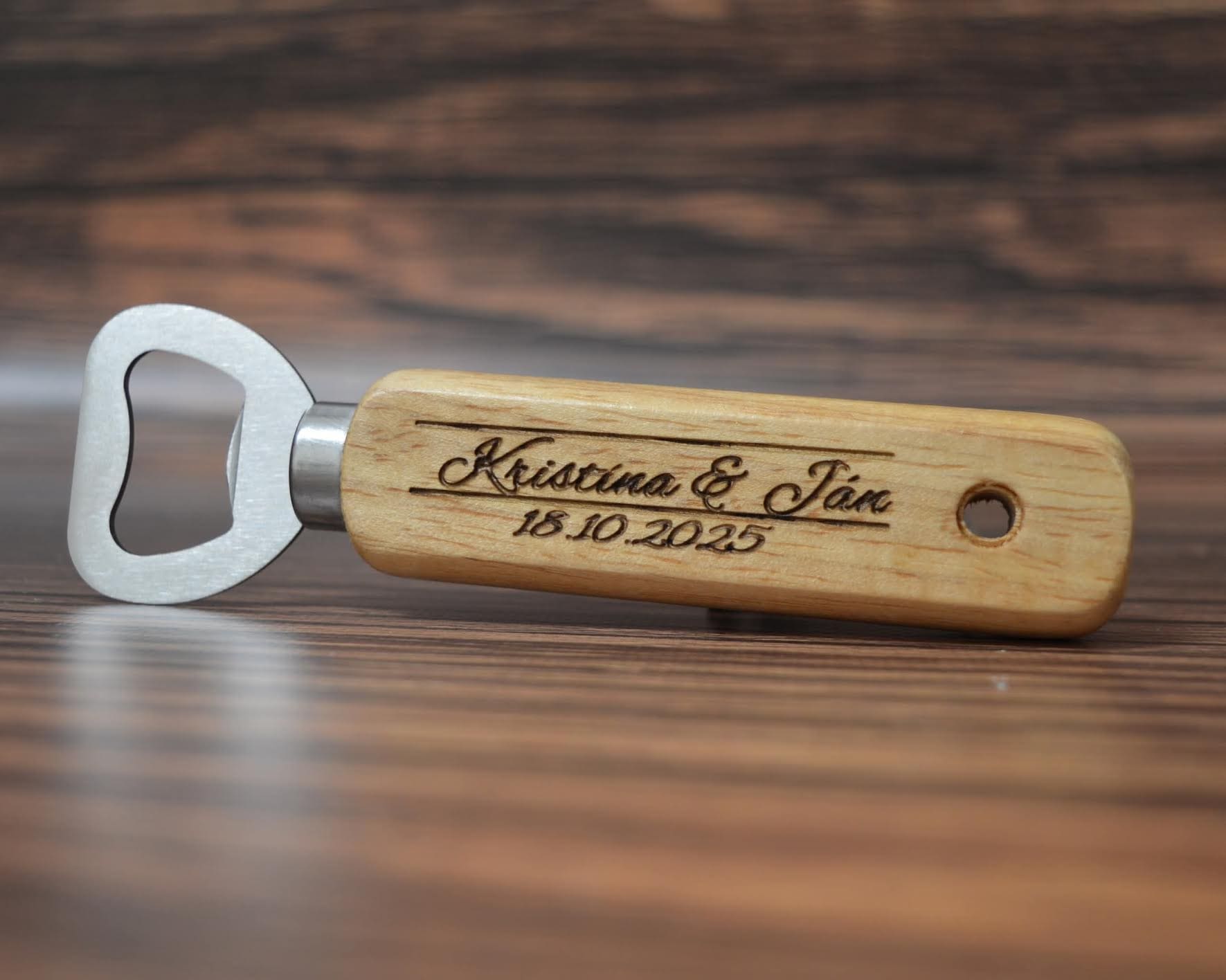 Gravírovaný otvárak na pivo s menami a dátumom svadby je elegantný a praktický darček pre novomanželov či hostí svadobnej oslavy. Vyrobený z kvalitného dreva a kovu, tento otvárak spája funkčnosť s jedinečným dizajnom. Gravírovanie umožňuje personalizáciu, vďaka čomu je tento produkt krásnou pamiatkou na nezabudnuteľný deň. Ideálny doplnok na každú príležitosť.