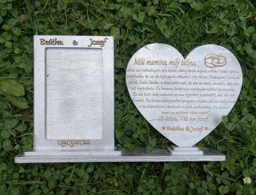 Jedinečné hrubé poďakovanie pre maminu a tatina vyrobené z kvalitného dreva v elegantnom striebornom prevedení. Tabuľka v tvare srdca s gravírovaným textom úprimne vyjadruje vďaku, lásku a úctu rodičom. Súčasťou darčeka je aj drevený rámik na fotografiu, ktorý umožní pridať osobný dotyk a spraviť z poďakovania krásnu pamiatku na svadobný deň alebo inú významnú príležitosť. Personalizované mená a dátum robia tento darček originálnym a nezabudnuteľným. Skvelý spôsob, ako rodičom poďakovať za všetko, čo pre vás urobili. Vhodné na vystavenie doma ako milá dekorácia a trvalá spomienka.