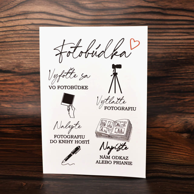 Informačná kartička „Fotobúdka“ s červeným srdcom je štýlovým a užitočným doplnkom na vašu svadbu alebo oslavu.