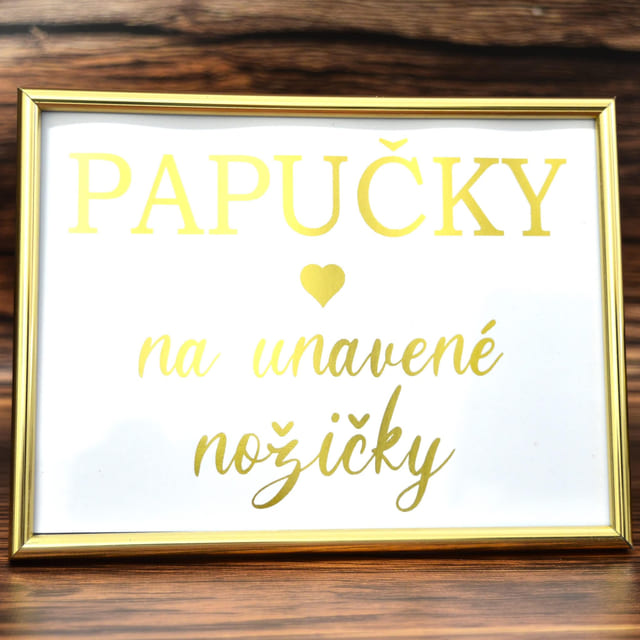 Informačná kartička „Papučky na unavené nožičky“ so zlatým textom a srdiečkom. Štýlový doplnok na oslavy, ktorý označuje miesto s papučkami pre pohodlie hostí.