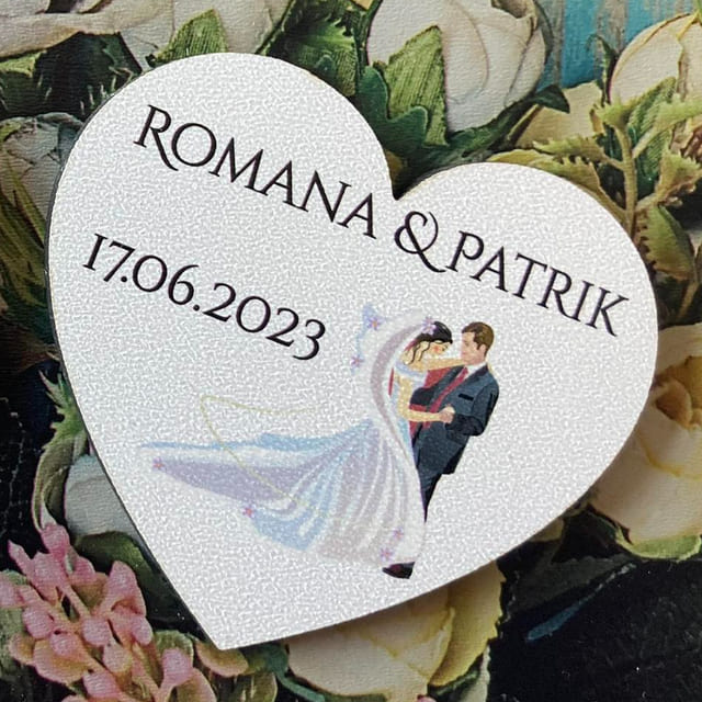 Magnetku vám pripravíme na mieru: doplníme mená novomanželov a dátum svadby (prípadne aj krátky text). Ideálna ako svadobná výslužka, darček pre hostí alebo drobná spomienka na váš deň D.