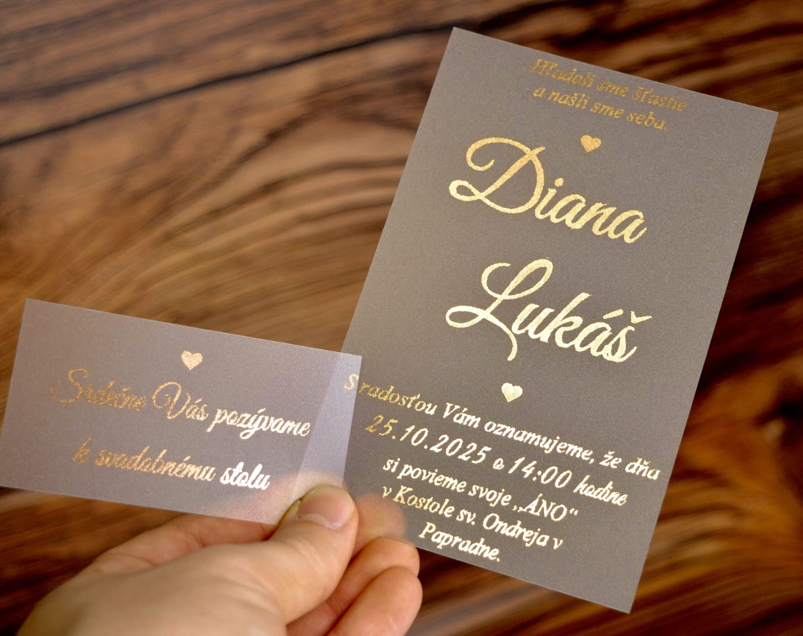 Všetky varianty ako: číslovanie stolov, zasadací poriadok, svadobného menu, menovka, pozvánka Vám zladíme do štýlu v akom je vyrobené svadobné oznámenie na fotke. Iba etiketa a nálepka (krúžok) budú tlačené na biely papier s metalickou tlačou. (ak nie je na fotke – na vyžiadanie Vám vieme grafický návrh samozrejme poslať na email.)