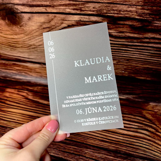 Mliečne oznámenie s metalickou striebornou a kapitálkami je moderné, čisté a výrazne elegantné. Polopriesvitný mliečny materiál pôsobí jemne a prémiovo, zatiaľ čo metalická strieborná tlač krásne odráža svetlo a dodáva oznámeniu luxusný efekt. Kapitálky (veľké písmená) zvýraznia mená aj hlavné informácie, takže oznámenie je na prvý pohľad čitateľné a štýlovo minimalistické.