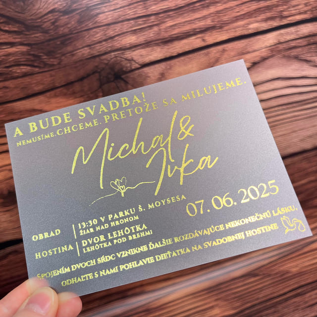 Zlaté písmo zvýrazňuje mená snúbencov, dátum, miesto obradu a hostiny, čím vytvára luxusný a moderný vzhľad. Perfektné pre páry, ktoré chcú spojiť svadbu s nezabudnuteľným oznámením pre rodinu a priateľov.