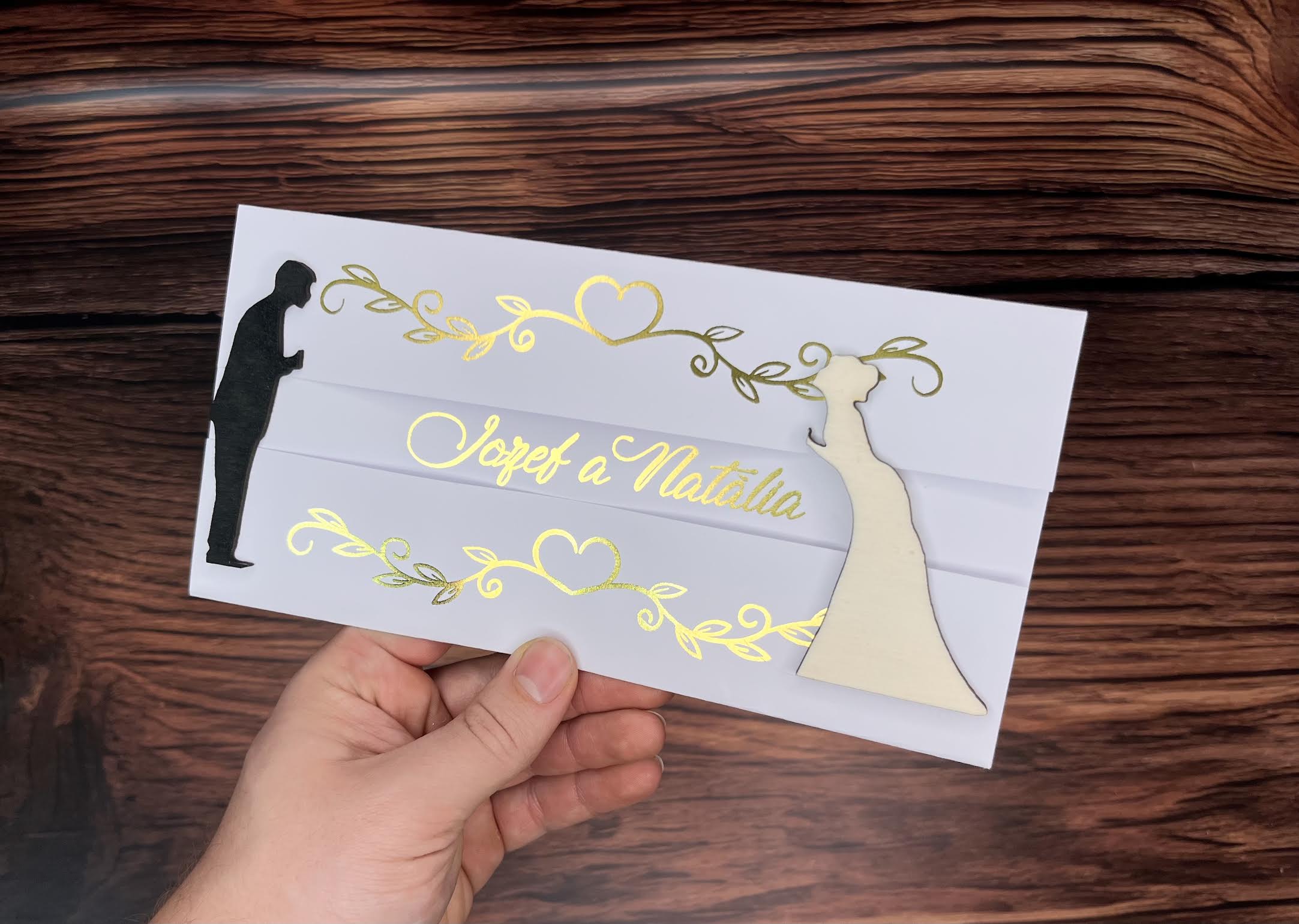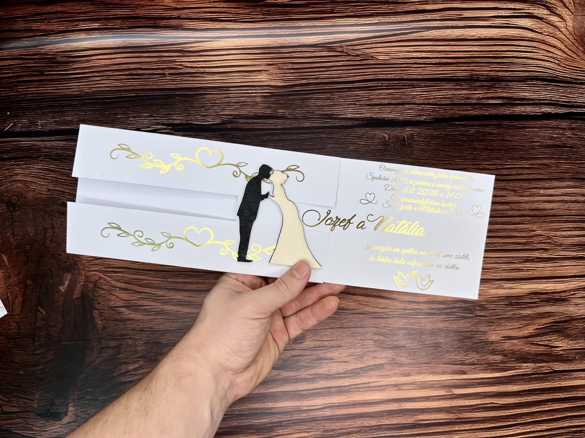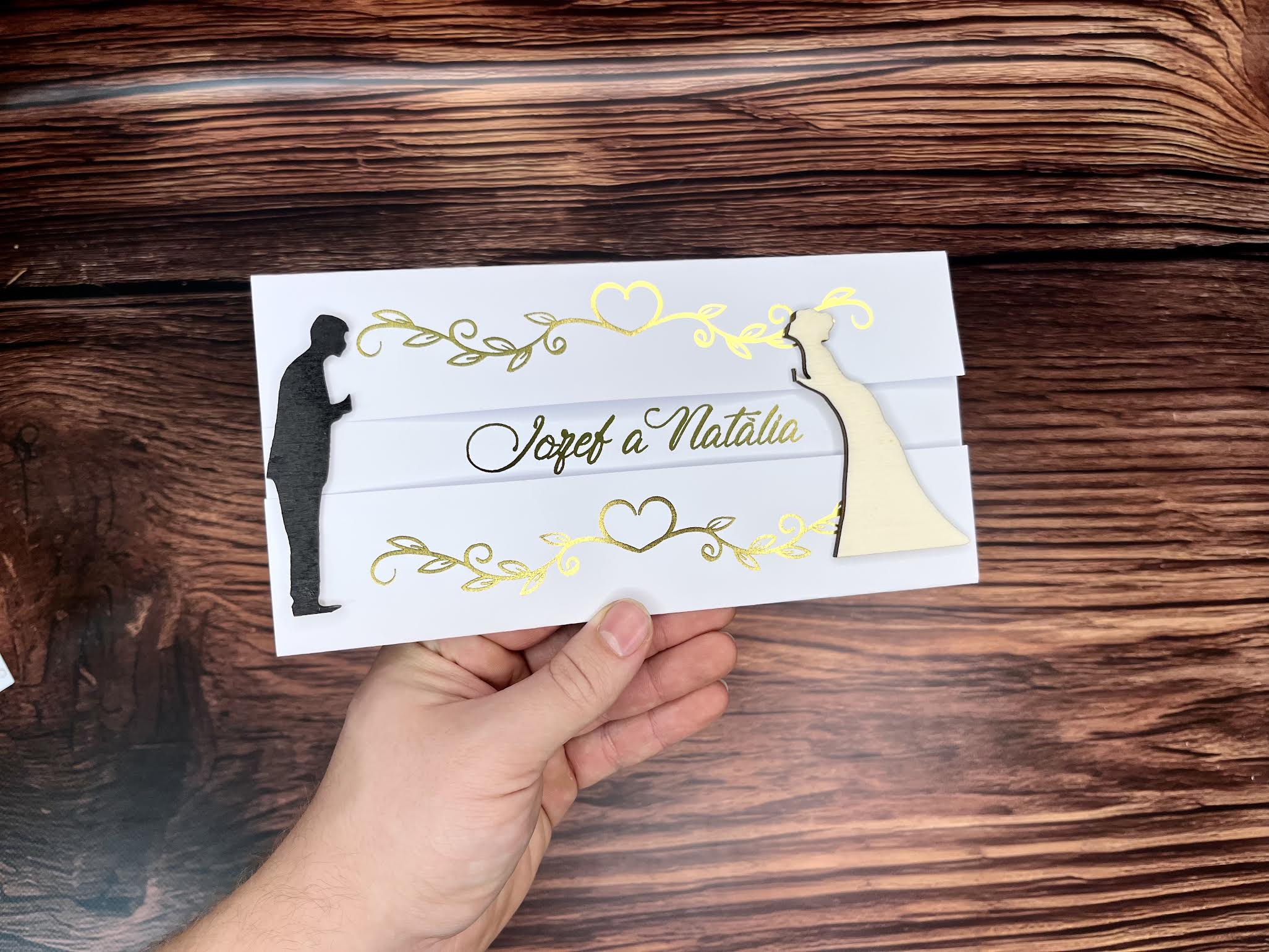 Pohyblivé oznámenie s metalickou zlatou tlačou je dokonalým spojením elegancie a originality. Tento jedinečný dizajn zaujme nielen svojím dynamickým pohybom drevených postavičiek nevesty v natural farbe a ženícha v čiernej, ale aj luxusným spracovaním so zlatými detailmi. Jemné ornamenty a srdiečka v metalickom prevedení dodávajú oznámeniu noblesu, zatiaľ čo precízne vyhotovené 3D prvky vytvárajú nezabudnuteľný efekt.