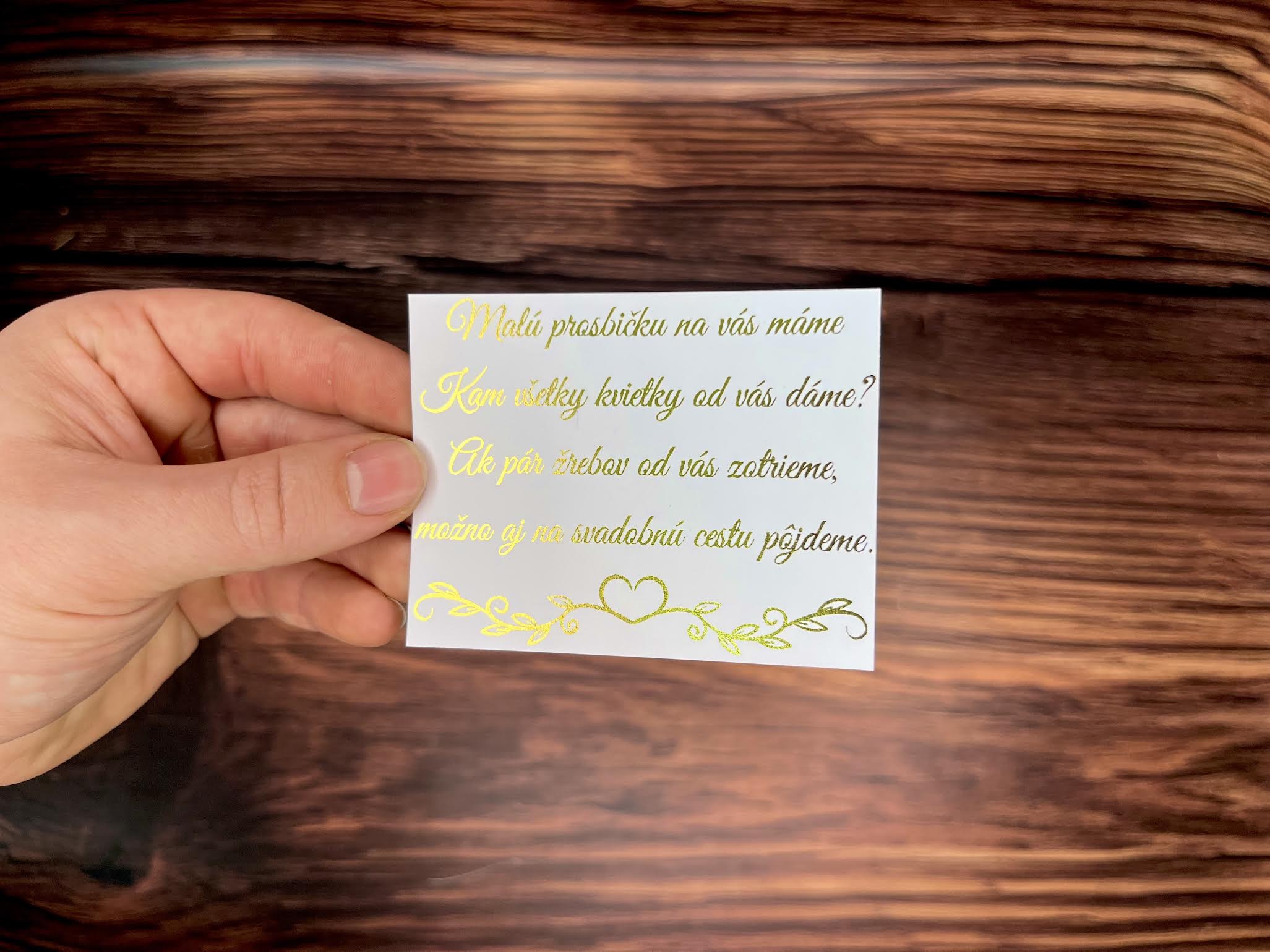 Vyrobené z kvalitného papiera, toto oznámenie je ideálnou voľbou pre páry, ktoré chcú svoj veľký deň oznámiť štýlovo a s osobitým šarmom. Svadobný text je možné plne personalizovať, aby presne vystihoval vašu jedinečnú lásku.