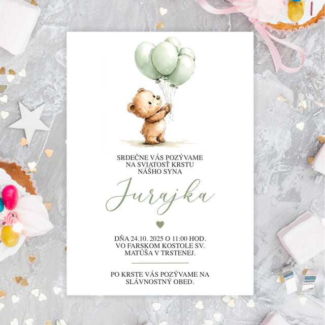 Roztomilá a nežná pozvánka na krst s mackom a balónikmi v jemných zelených odtieňoch.