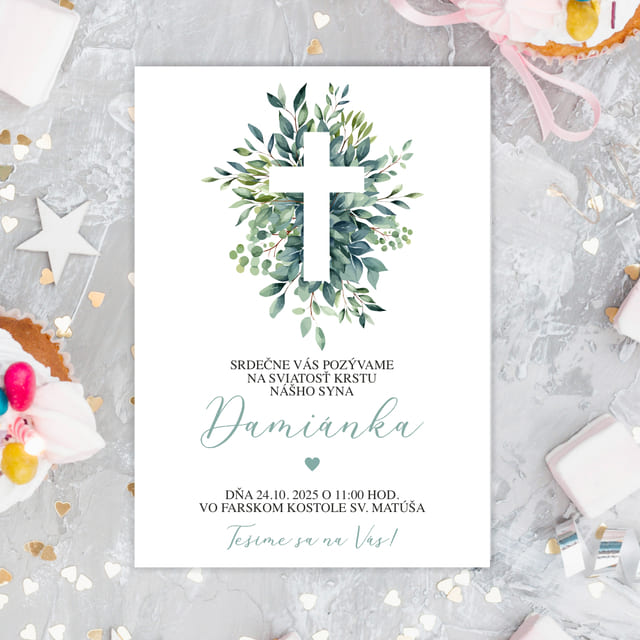 Elegantná pozvánka v prírodnom štýle, ktorá spája jednoduchosť a symbol viery. Dizajn s bielym krížikom obklopeným zeleňou dodá vášmu oznámeniu jemnosť a pokoj.