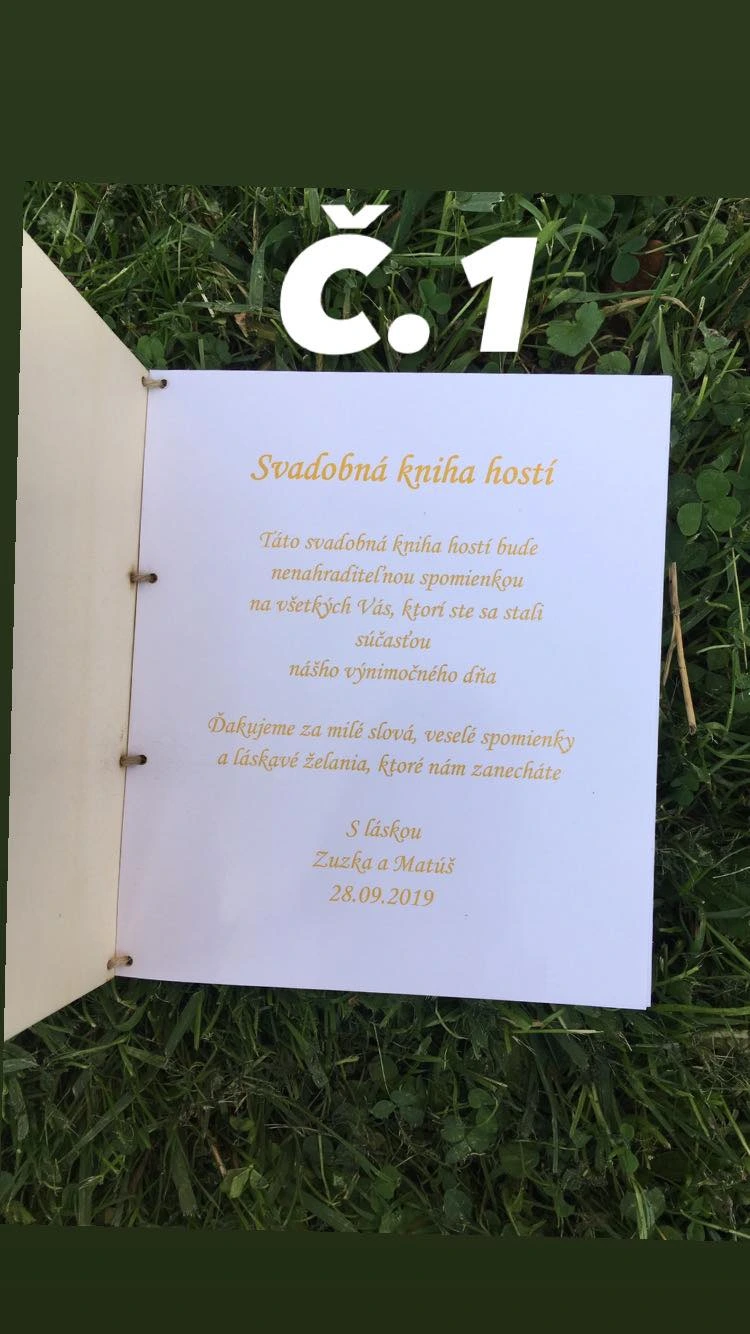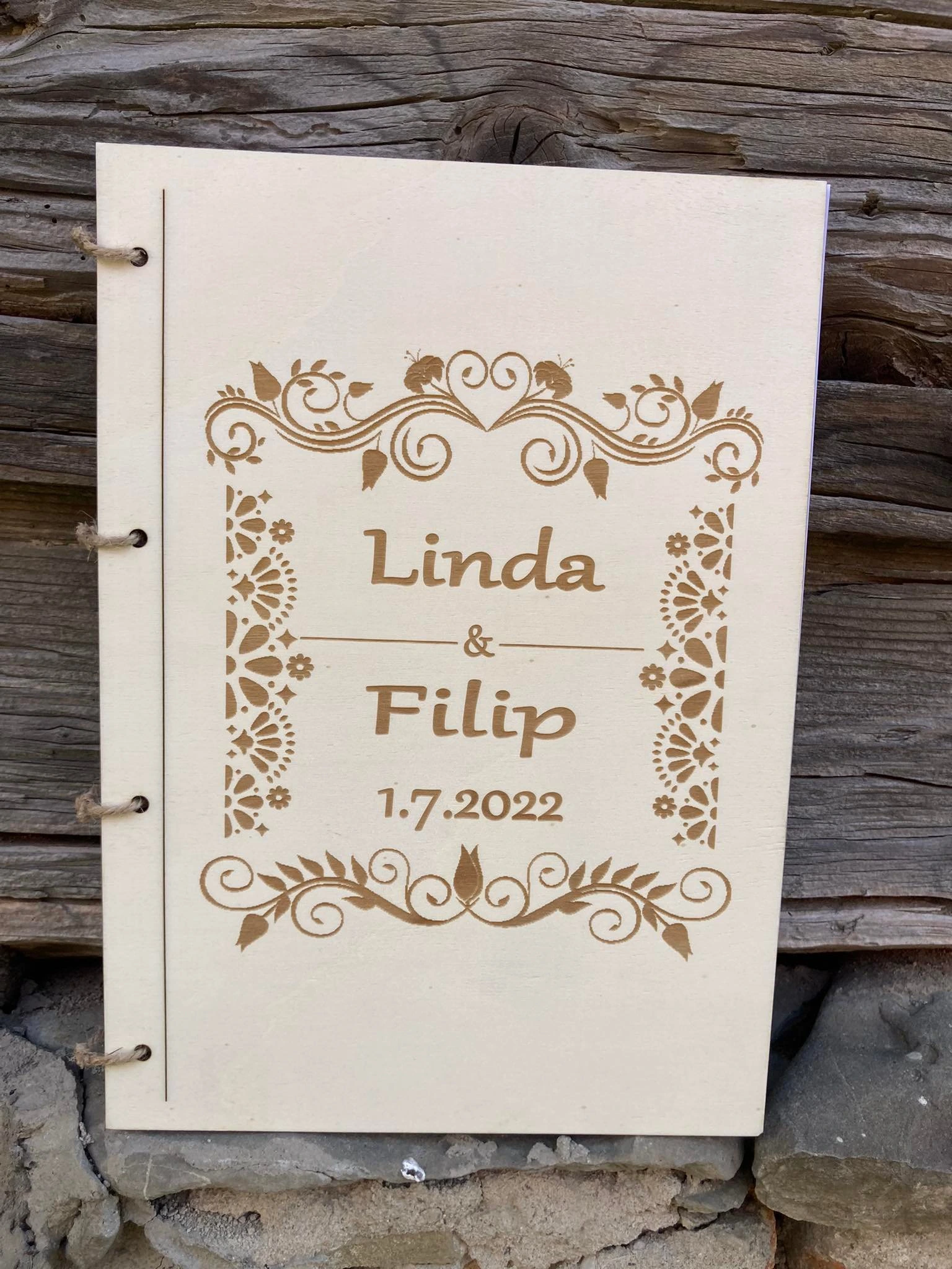 Svadobná kniha hostí s vypaľovaným motívom a textom.