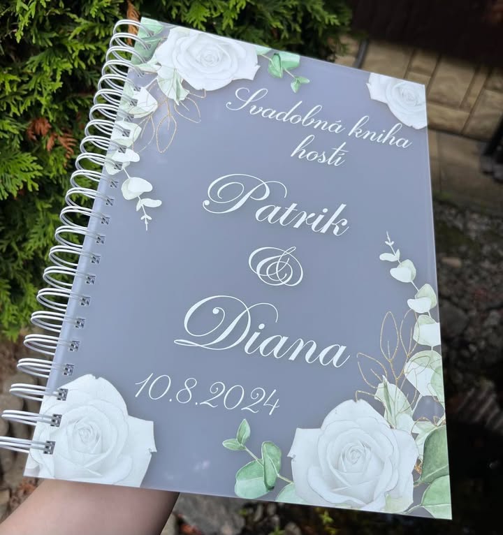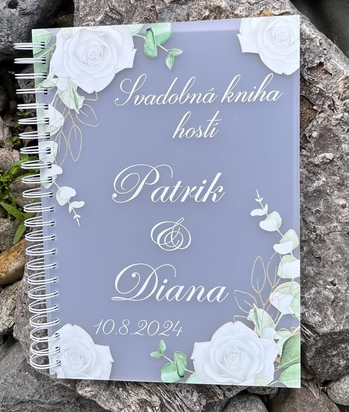 Svadobná kniha hostí s farebnou potlačou a vypáleným textom.