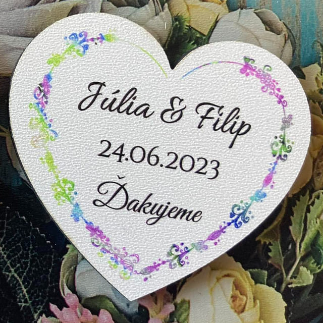 Personalizácia je na mieru: doplníme mená novomanželov, dátum svadby a krátky text (napr. „Ďakujeme“).