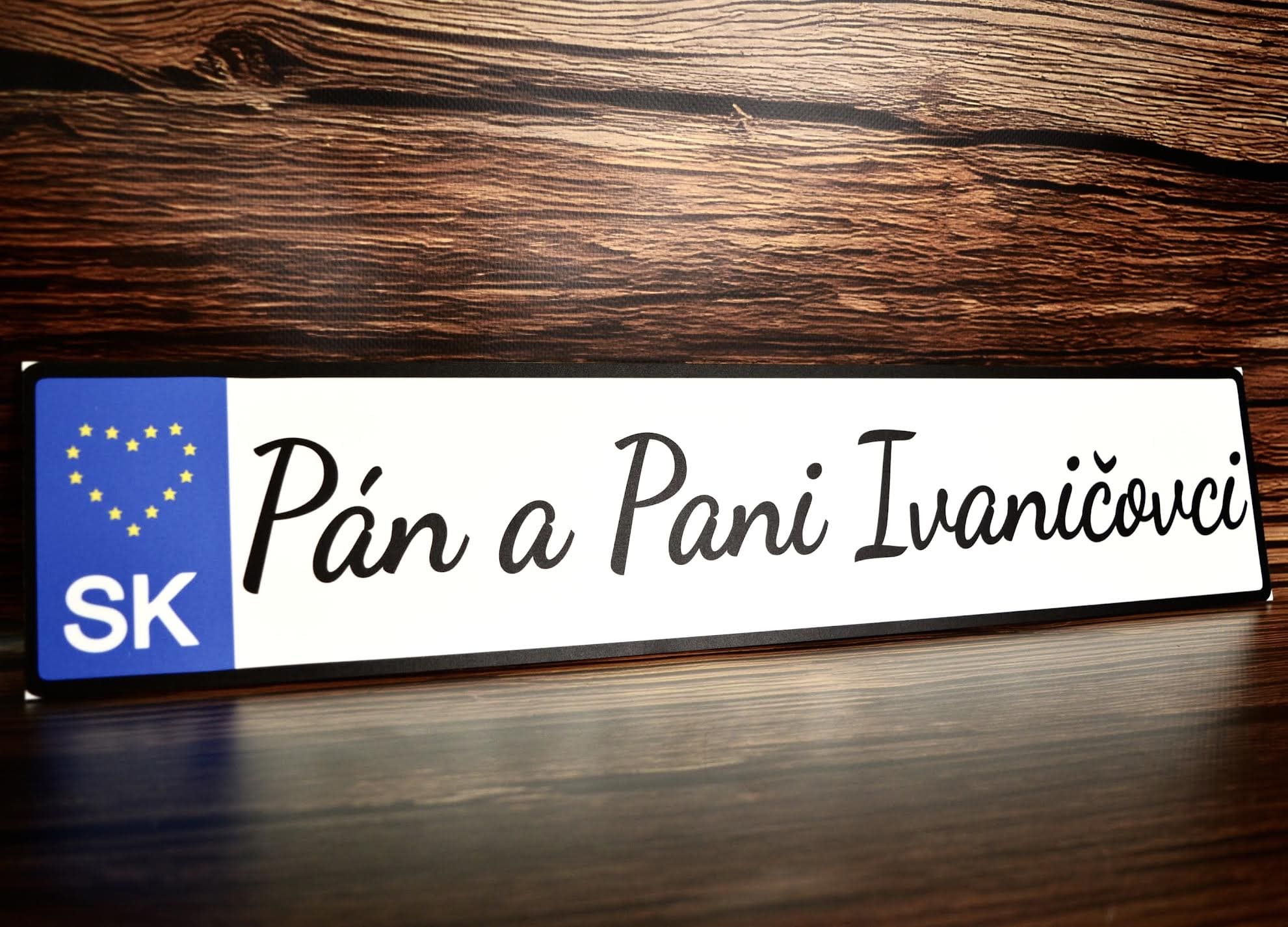 Svadobná ŠPZ s nápisom „Pán a Pani + priezvisko“ je personalizovaný doplnok pre svadobné auto, ktorý dodá vášmu veľkému dňu jedinečný a elegantný štýl. Tabuľka imituje autentický vzhľad ŠPZ s modrým pruhom, hviezdami v tvare srdca a skratkou „SK“. Elegantné písmo a možnosť vlastného priezviska robia tento doplnok ideálnym nielen na výzdobu auta, ale aj ako krásnu pamiatku na váš svadobný deň.
