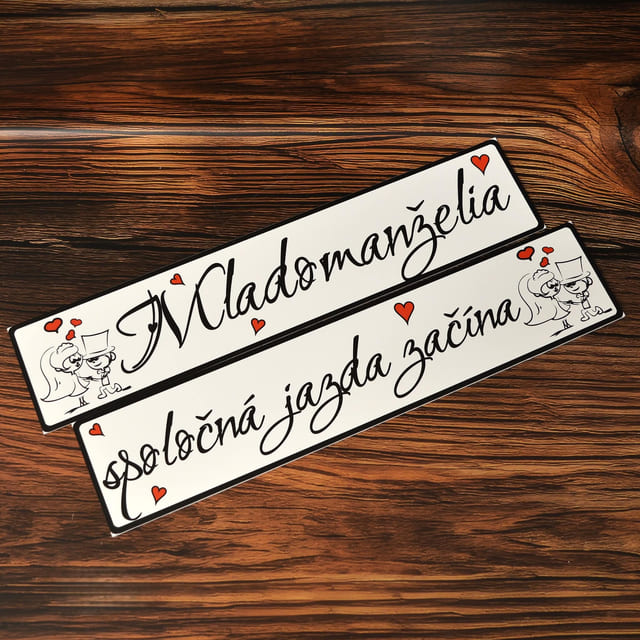 Štýlová svadobná ŠPZ na auto je originálnym doplnkom na svadobný deň. Obsahuje nápisy „Mladomanželia“ a „spoločná jazda začína“, ktoré sú doplnené červenými srdiečkami a veselou ilustráciou nevesty a ženícha.