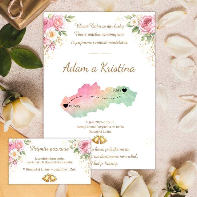 Svadobné oznámenie – Farebná mapka je originálne oznámenie, ktoré má v sebe aj kúsok vášho príbehu. Akvarelová mapka znázorňuje časti Slovenska, odkiaľ pochádza nevesta a ženích, takže hostia hneď pochopia, ako sa vaše cesty spojili. Jemné kvetinové detaily dodajú romantiku a elegantný vzhľad, ktorý krásne vynikne už v obálke.