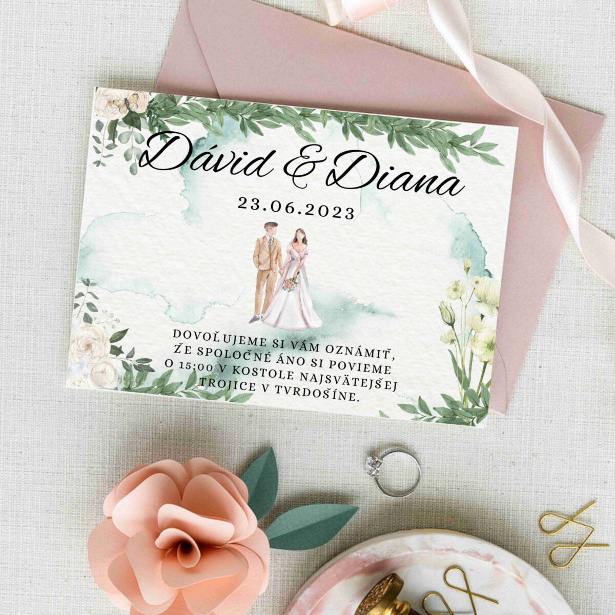 Svadobné oznámenie greenery s postavičkami ženícha a nevesty je dokonalým spôsobom, ako štýlovo a originálne oznámiť váš veľký deň. Tento dizajn spája nadčasovú krásu prírody s hravým a láskyplným motívom postavičiek novomanželov, čím vytvára jedinečný a harmonický celok. Motív „Greenery“, ktorý sa vyznačuje jemnými zelenými odtieňmi a prírodnými prvkami, symbolizuje sviežosť, nový začiatok a harmóniu, čo dokonale vystihuje význam svadobného dňa.