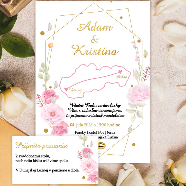 Svadobné oznámenie – Mapka ružová je ideálne pre páry, ktoré chcú hosťom povedať nielen kedy, ale aj kde sa začína ich veľký deň. Jemná ružová mapka doplnená o romantické kvety a zlaté línie pôsobí elegantne a zároveň prakticky. Hostia sa zorientujú na prvý pohľad a ty máš oznámenie, ktoré vyzerá výnimočne aj vo fotkách.
