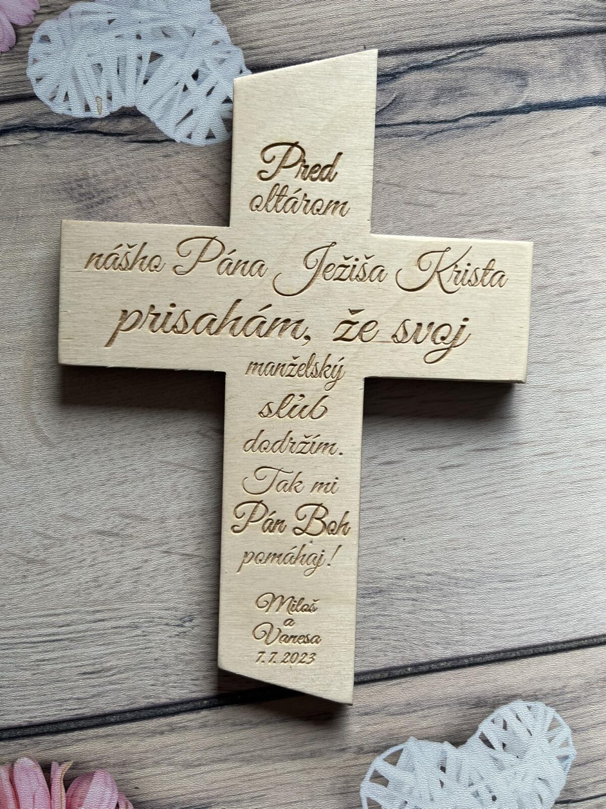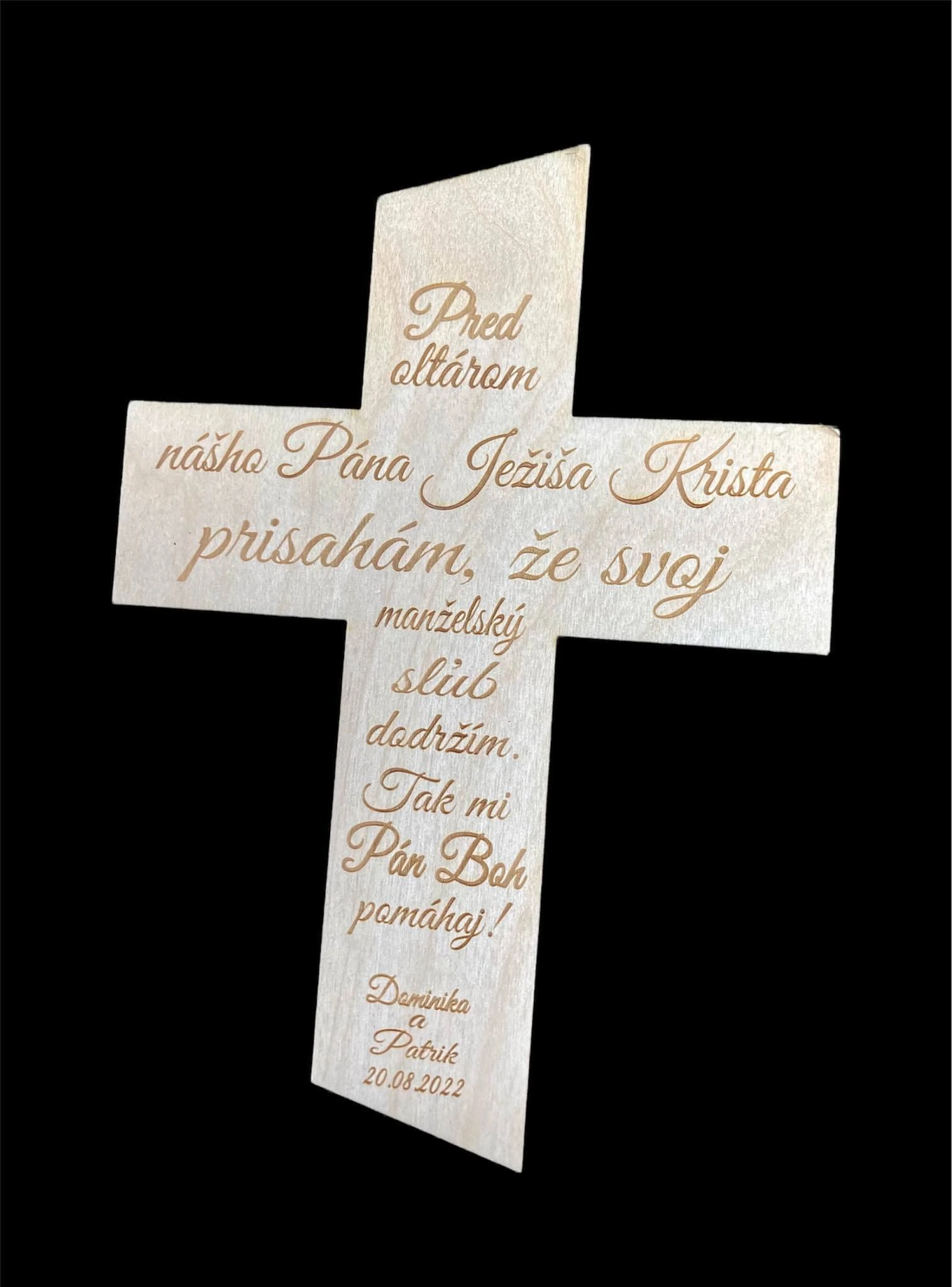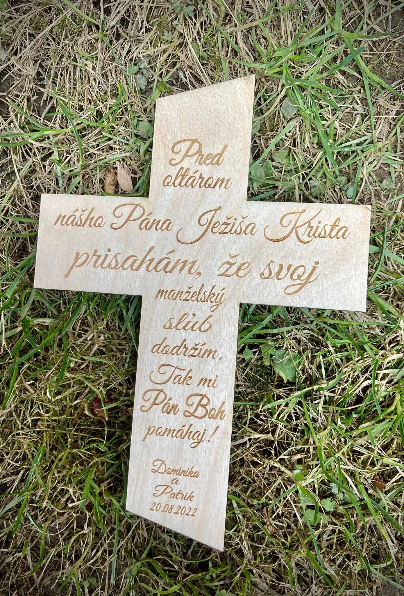 Drevený svadobný kríž s krásnym nápisom „Pred oltárom nášho Pána Ježiša Krista prisahám, že svoj manželský sľub dodržím. Tak mi Pán Boh pomáhaj“, doplnený menami a dátumom svadby novomanželov, je nádherný a významný symbol viery a lásky, ktorý bude navždy pripomínať deň, keď novomanželia spečatili svoj zväzok pred Bohom.