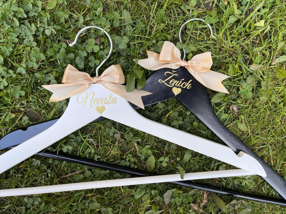 Tento unikátny svadobný vešiak je zdobený personalizovanými zlatými nápismi, zlatým srdiečkom a mašľou. Biely vešiak „Nevesta“ s krémovou mašľou a čierny vešiak „Ženích“ s krémovou mašľou sú ideálne na svadobné šaty a oblek.