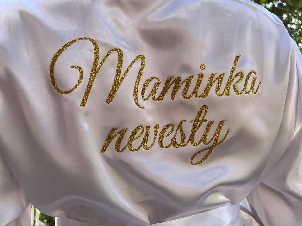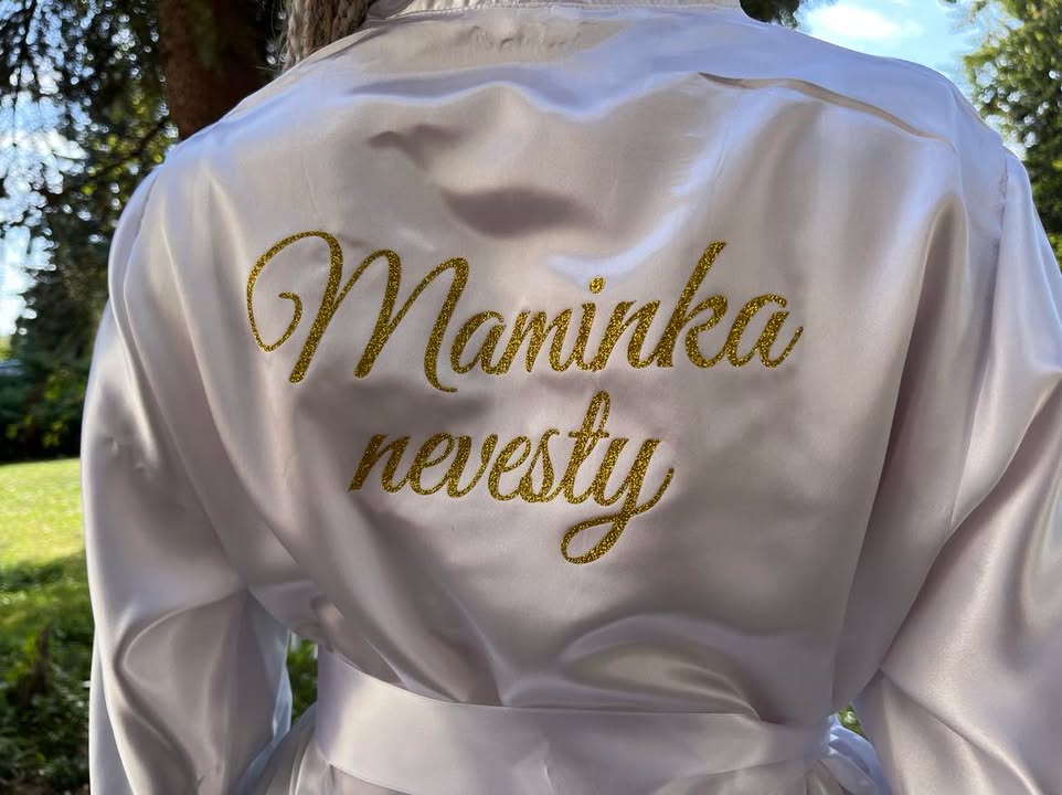 Svadobný župan pre maminku nevesty s trblietavým zlatým nápisom je elegantný a dojemný spôsob, ako vyjadriť vďačnosť a oceniť významnú úlohu maminky počas svadobného dňa. Tento župan je navrhnutý tak, aby kombinoval pohodlie a štýl, a je dostupný vo variantoch s čipkou alebo bez čipky.