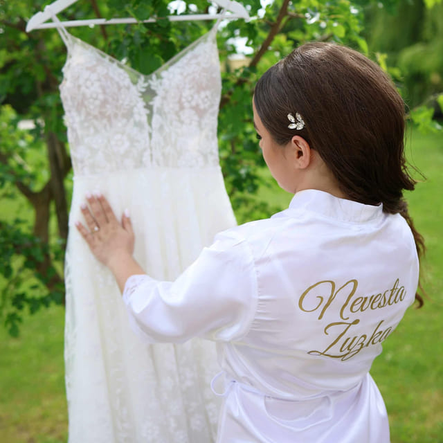 Luxusný svadobný župan z jemného saténu s elegantným nápisom „Nevesta“ a menom podľa vášho želania je dokonalým doplnkom pre nevestu. Zahviezdite na ranných prípravách alebo na svadobnom fotení.