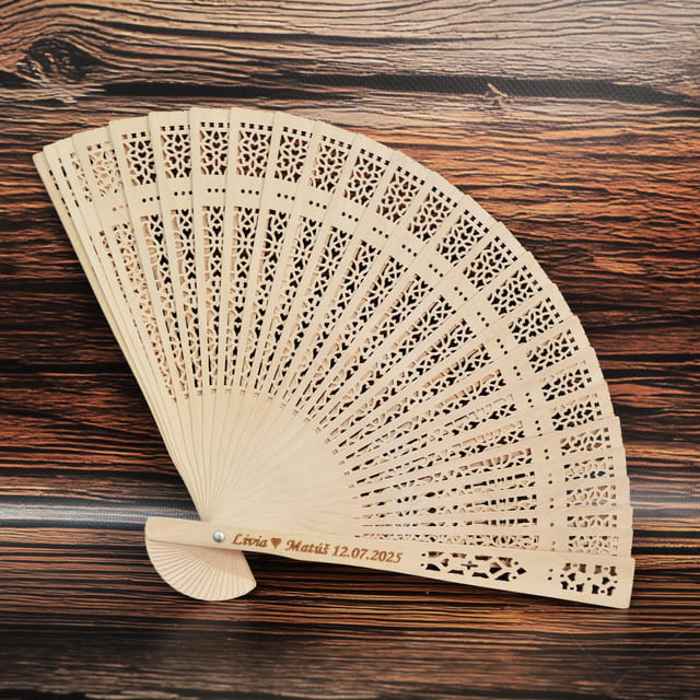 Elegantný drevený vejár s jemným vyrezávaným vzorom je krásnym a praktickým doplnkom na svadbu či iné významné udalosti. Vejár je personalizovaný – na spodnej časti nesie vygravírované mená, srdiečko a dátum podľa vášho želania. Tento jedinečný kúsok poslúži ako výnimočná pamiatka pre nevestu, ženícha, družičky alebo svadobných hostí. Vhodný aj ako originálny darček k výročiu alebo narodeninám.